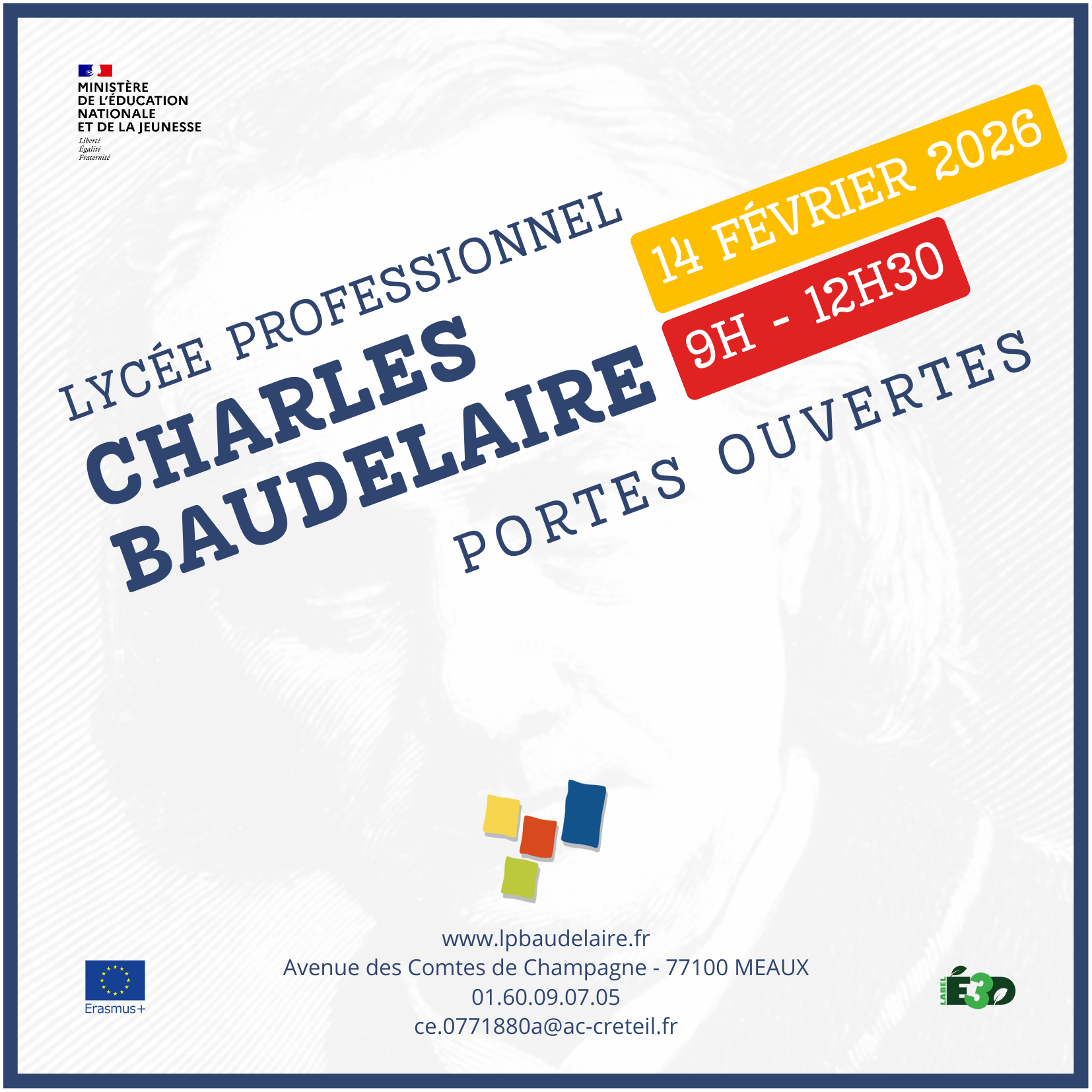 Le lycée professionnel Charles baudelaire ouvrira ses portes le samedi 14 mars samedi 14 février 2026 de 9h00 à 12h30.