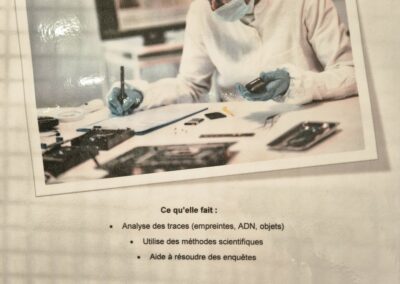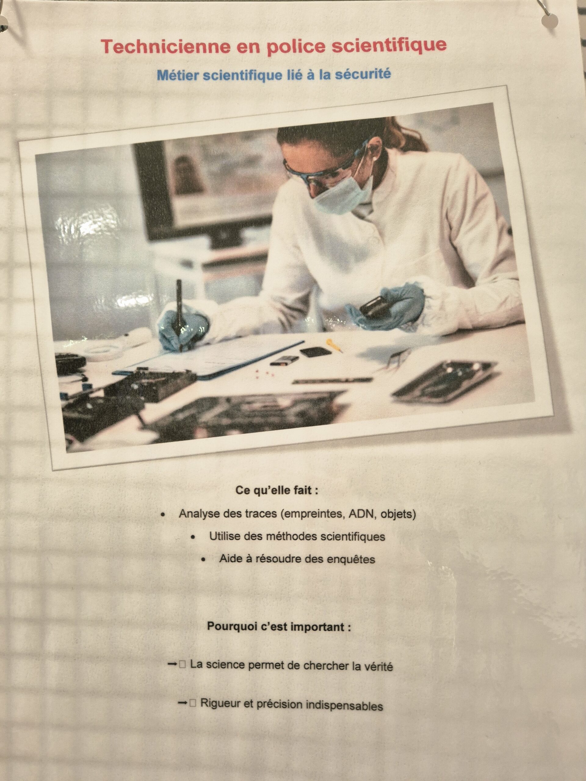 Sous l’impulsion de leur enseignante, les élèves ont animé un stand d’information mettant en lumière des fiches métiers variées, allant de la gestion administrative (AGORA) aux métiers de la sécurité et du commerce. L’objectif ? Montrer que, quel que soit le parcours choisi, les compétences scientifiques (logique, analyse de données, technologies numériques, psychologie sociale) sont partout.