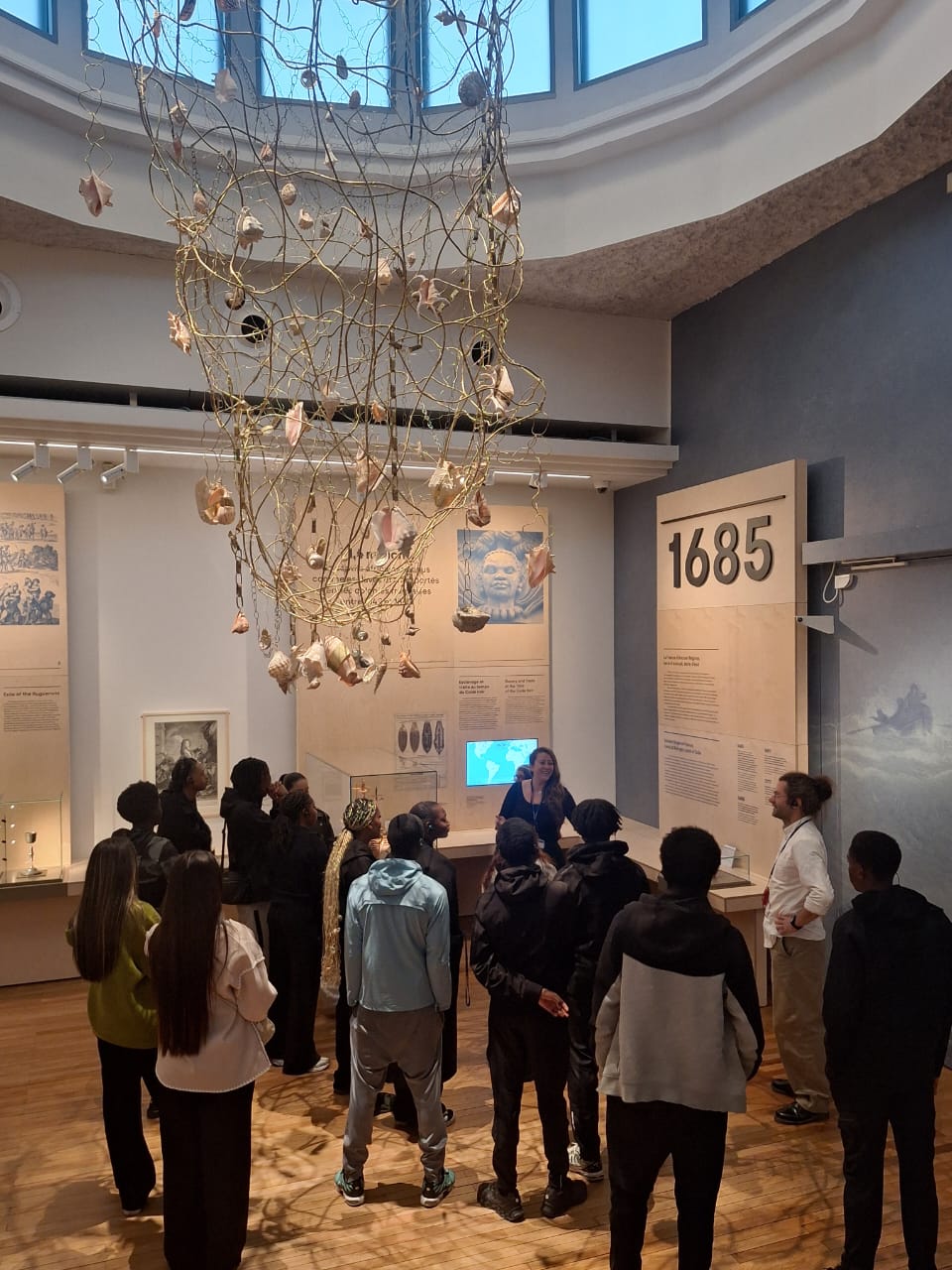Dès notre arrivée, nous avons été accueillis par une médiatrice culturelle passionnée qui nous a accompagnés tout au long de la visite. Elle a commencé par nous présenter l’histoire du musée lui-même, installé dans l’ancien Palais de la Porte Dorée, un bâtiment emblématique de l’exposition coloniale de 1931. Cette introduction a permis aux élèves de comprendre comment le lieu, autrefois symbole d’un passé colonial, a été transformé en un espace de réflexion sur l’accueil, la diversité et la mémoire collective.